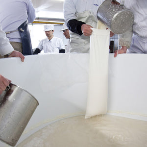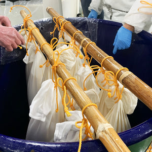 18%まで磨いた米で、湧き水のように瑞々しく透明感ある味わいを得るため、醪は「袋吊り」にて搾りました。「袋吊り」とは、醪を入れた酒袋を吊るし、圧力をかけず自然にしたたり落ちる雫だけを集める技法です。酒の搾り方としては最も手間のかかる技法ですが、自重で滴る雫だけを集めることで、上質かつ繊細な味わいを得ることができます。