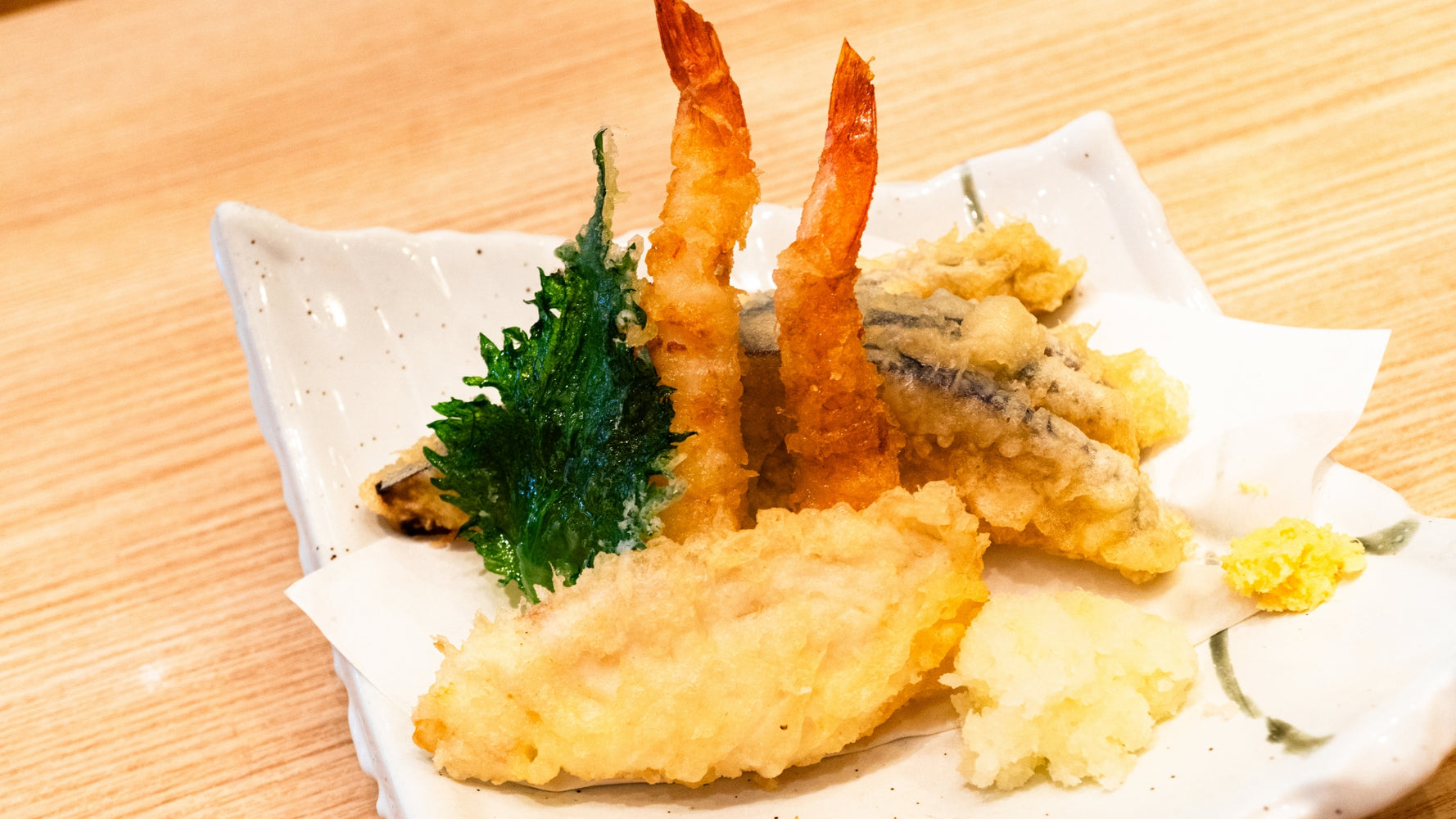 白身魚の刺身、魚介類のカルパッチョ、天ぷら、ローストビーフ、トマトのカプレーゼ、生春巻き、モッツァレラチーズ、サラダ、カットフルーツ、柑橘系のソースを使った料理